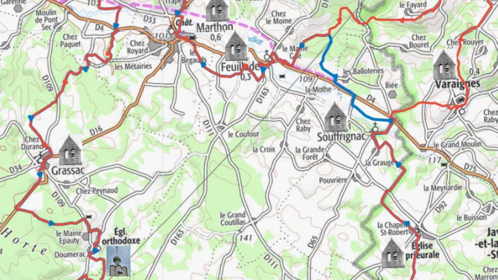 Itinéraire permanent VTT sur la route des clochers, entre Bandiat et Forêt d'Horte. Notre région se situe au carrefour de grandes randonnées itinérantes : la Flow Vélo, la Scandibérique, le Tour Charente VTT et sa transversale Est, le Tour Charente Vélo. Adossé au Tour Charente VTT, le circuit "Ronde des clochers" emprunte les chemins et sentiers des communes de la Vallée du Bandiat et de la Forêt d'Horte. Départ conseillé depuis Feuillade, le circuit passe par Marthon / St-Germain de Montbron / Grassac / Charras / Mainzac / La Chapelle St-Robert (24) / Souffrignac / Varaignes (24). Distance : 60km, avec une variante Feuillade direct à partir de Souffrignac 52km.