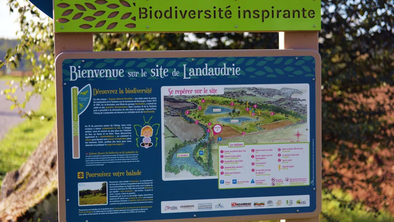 Un sentier pour découvrir la richesse du site de Landaudrie. Le site de Landaudrie, ancienne carrière de sable, situé entre la plaine de Landaudrie et la rivière Tardoire, est classé "Espace Naturel Sensible". Devenu un véritable écrin de biodiversité, promeneurs et pêcheurs y sont les bienvenus. Ouvert au public tout au long de l'année, il est possible de le parcourir par un sentier d'interprétation "biodiversité inspirante" d'environ 2 km autour de l'étang. A chaque station, vous en saurez un peu plus sur l'histoire du lieu, sa faune et sa flore. Découvrez également le "biomimétisme" : comment la nature peut devenir une source d'inspiration pour les hommes. Venez retirer le livret-jeu à l'Office de Tourisme.